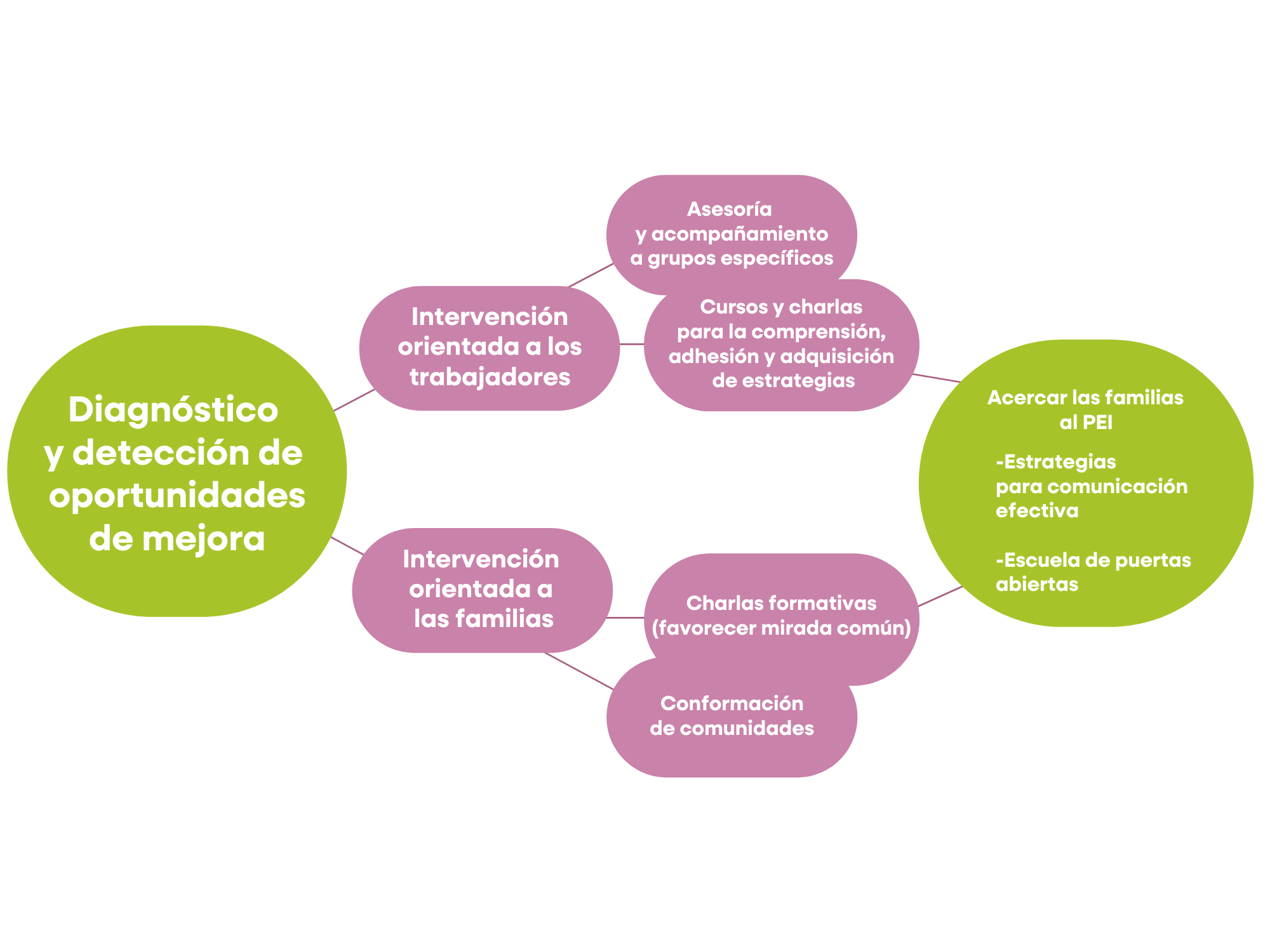 Nuestro propósito es brindar un acompañamiento contextualizado, que logre responder a las necesidades y propósitos de las comunidades educativas para fortalecer sus vínculos con las familias. Para esto, una vez que tomamos contacto con quienes buscan nuestra ayuda, proponemos las siguientes etapas de trabajo: